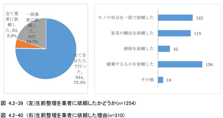 「生前整理」をしていなかった場合、その後の整理手段は、「全て自分たちで行った」人が75.3%と最も多く、すべて業者に依頼した人は5.0%、一部業者に依頼した人は19.7%であった(図4.2-39、図4.2-340)。業者に依頼したという回答のうち、依頼した作業内容で「破棄」するという回答が最も多かった。その他の意見では、「家の取り壊し」や「不動案売却」、「古美術品の鑑定」、「神棚」を依頼したことが分かる。