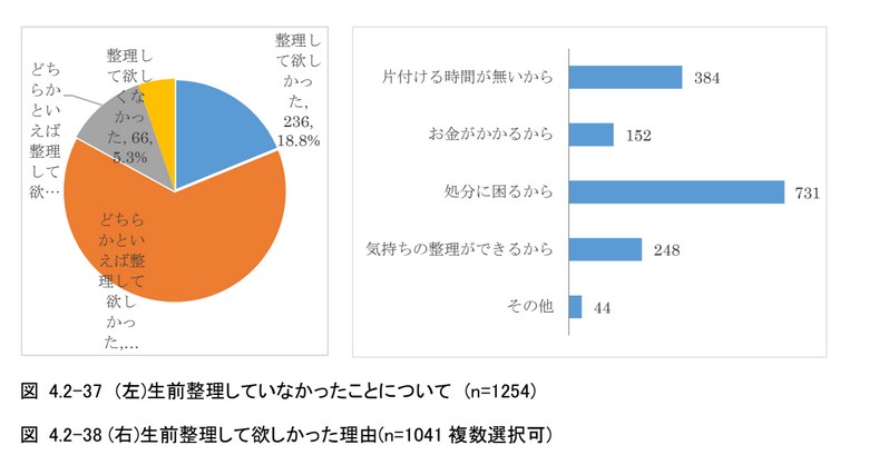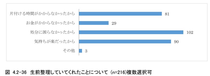 「生前整理をしてくれていて良かった」(図4.2-35)という理由は、「処分に困らなかったから」、「気持ちが楽だったから」という回答が多くみられた。「整理しないで欲しくなかった」の理由としては「遺してほしいものがあった」、「自分で片付けしながら気持ちの整理をしたかった」とあった(図4.2-36)。本人がどのようにしたいか、遺族がどのようにしてほしいか、を家族で話し合うことが大切だと感じる。