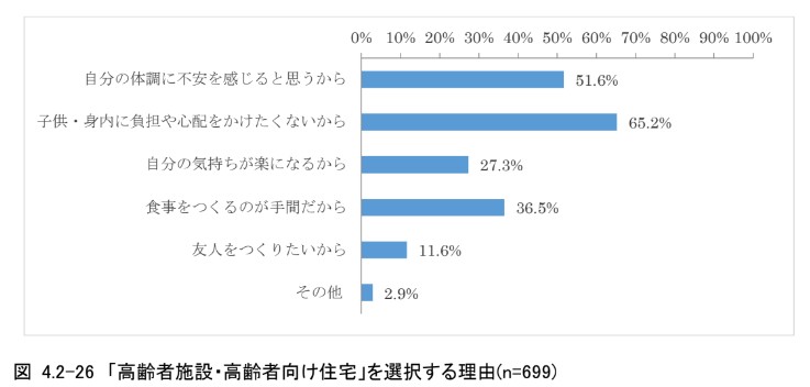 図4.2-23 で「高齢者施設・高齢者向け住宅」を選択した理由では、「子供・身内に負担や心配をかけたくないから」が65.2%で最も多く、家族への配慮や自身の安心感などを優先した結果の選択と考える。また少数ではあるが、「友人をつくりたいから」という回答も11.4%あり、施設は人とのつながりの場であることが分かる(図 4.2-26)。