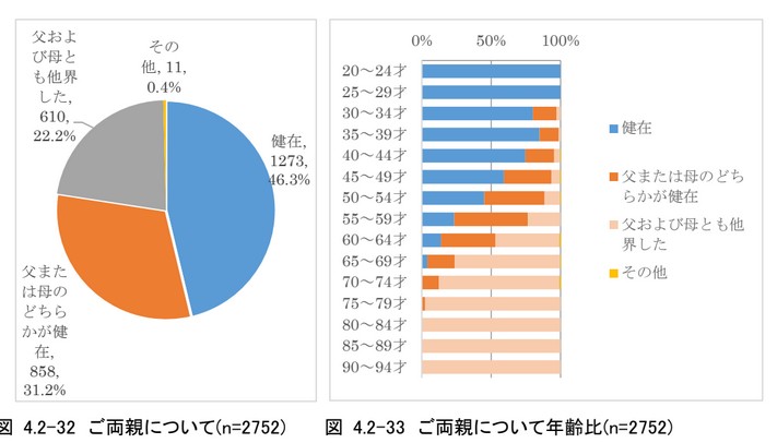 両親のうち、どちらかもしくはご両親ともに亡くなった人は53.7%、ご健在の人は46.3%である(図4.2-32、図4.2-33)。