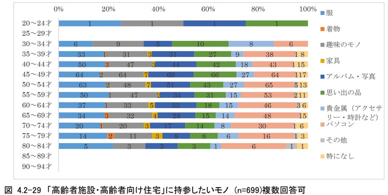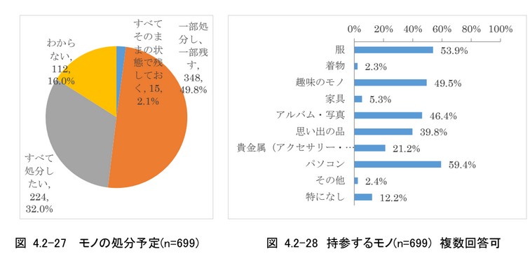 「「高齢者施設・高齢者向け住宅」に移る際にモノはどうするか?」という設問に対して、「一部処分し、一部残す」割合が49.8%で最も多いが、一方で、32%の人が「すべて処分したい」と回答している(図4.2-27、図4.2-28)。持っていきたいモノとしては、「パソコン」が59.4%で、続いて「服」、「アルバム・写真」、「思い出の品」があげられた。