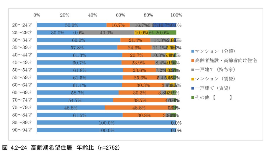 年齢別の変化をみると、30~60代では約6割の人が「マンション(分譲)」で住むことを希望している(図4.2-24)。70代80代の高齢層は、「高齢者施設・高齢者向け住宅」を希望する人が多いが、80代後半とさらに高齢になると、「高齢者施設・高齢者向け住宅」への入居希望者は少ないと読み取れる。
