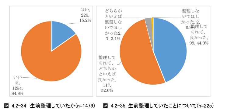 亡くなった親が「生前整理」をしていたという回答は15.2%で、残る84.8%は「生前整理」していなかったという結果である(図 4.2-34)。「生前整理」をしていた回答のうち、「「生前整理」をしてくれていて良かった」と感じている割合は44%、「どちらかといえば良かった」が52%であり、「生前整理」をすることは本人にとっても遺族にとっても良いことだと感じる。一方で、「整理しないで欲しかった」、「どちらかといえば、整理しないで欲しかった」という人もいて、一概に「生前整理」をすべきとは言い難い(図 4.2-35)。