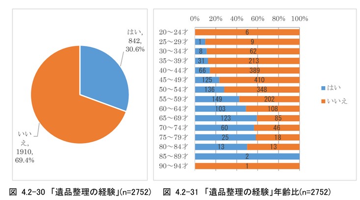 遺品整理は約30%の人が経験があり、7割の人は経験が無いことが分かった(図4.2-30)。年齢別にみると、自身の親が80~90代にあたる60代の人は、遺品整理の経験者が多いことが読み取れる(図4.2-31)。