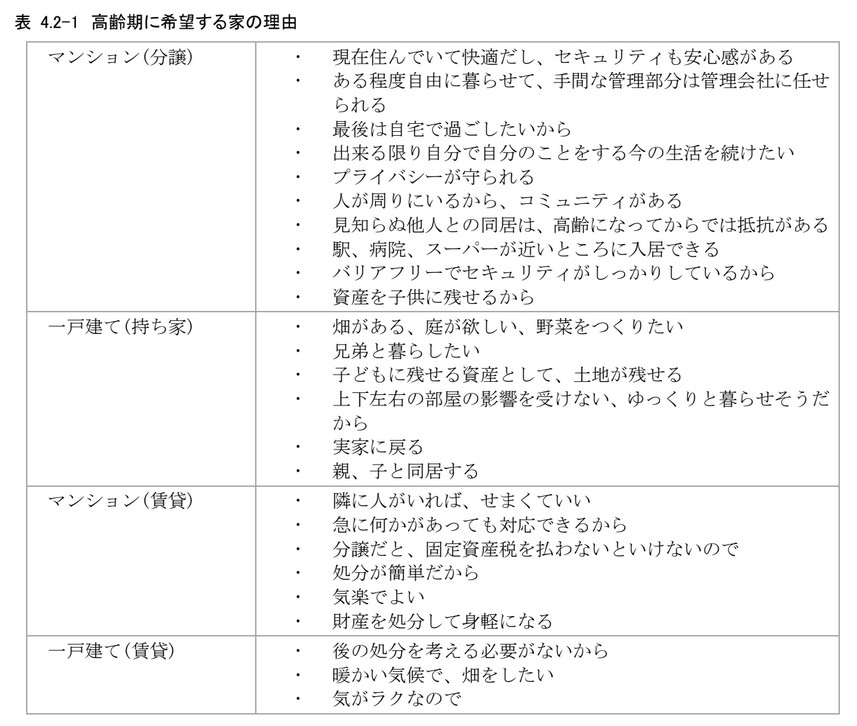 高齢期に希望する住居の選択理由を記述してもらった結果を以下に示している(表4.2-1)。「高齢者施設・高齢者向け住宅」は別途詳細を質問している為、除外し、「その他」は多くが「わからない」という回答であった為、除外する。記述内容の傾向として、「自由」、「プライバシー」、「安心」といったワードの使用頻度が高いように感じる。