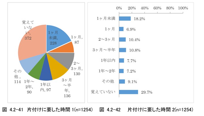 「生前整理」をしていなかった場合に、最終的に整理にかかった時間について調査した(図4.2-41、図4.2-42)。「覚えていない」という回答はあるが、1か月未満で終了した割合は約20%と比較的多く、1~2年という長期間かかった人もいると分かる。「その他」の回答では「4~5年」、「10年以上」が数件あり、多くは「途中」、「手つかず」という意見だった。整理をすることに気が進まない場合や、モノが多くて終わらない場合などが考えられる。