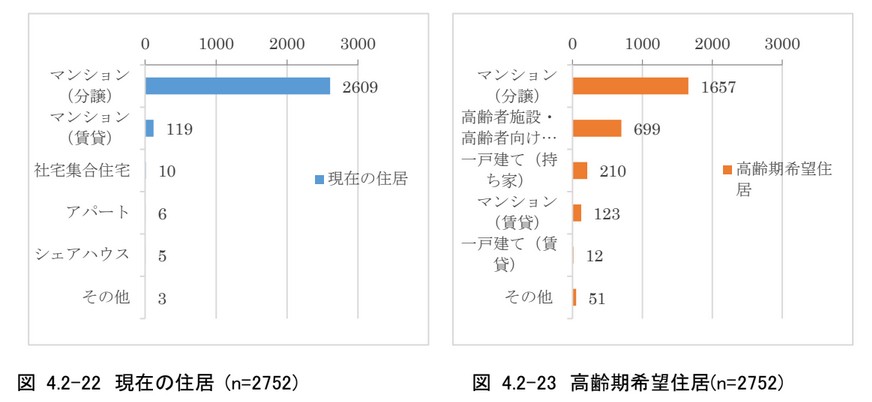 現在、「分譲マンション」に居住中が2609人(94.8%)、その後高齢になって住みたい場所として、1657人(60.2%)が「分譲マンション」をあげており、マンションで住むことを希望する人が多いことが分かる(図4.2-22)。しかし、分譲マンションから「高齢者施設・高齢者向け住宅」に住み替えを考える人も一定数存在している(図4.2-23)。本アンケートの回答者は「集合住宅」に居住しているという前提がある為、現在の住居に関して、選択肢に「戸建」を設けていない。以下の左図(図4.2-22)が現在の住居で、右図(図4.2-23)が高齢期希望住居グラフである。マンションから戸建への移行を希望している人もおり、また「その他」を選択した人は「まだわからない」という回答だった。