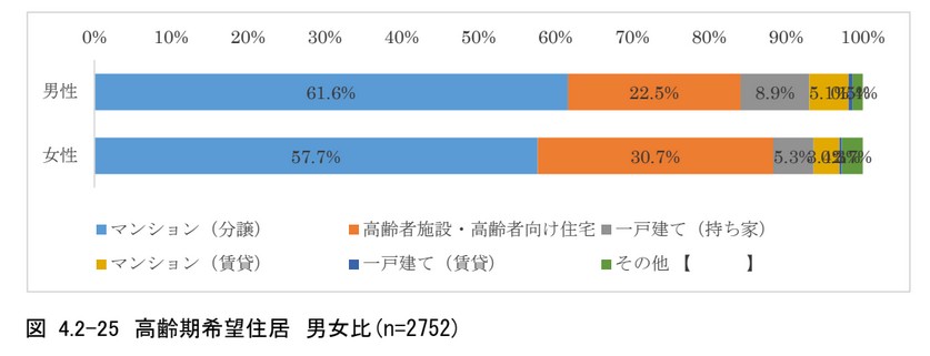 性別で比較すると、男性は「マンション(分譲)」と「戸建(持家)」、「マンション(賃貸)」で女性よりも割合が高い(図4.2-25)。男女で最も大きな差があった選択肢は「高齢者施設・高齢者向け住宅」であり、男性は女性よりも「高齢者施設・高齢者向け住宅」への住み替えに懸念がある、もしくは自宅で過ごしたいという思いが強いと推測できる。