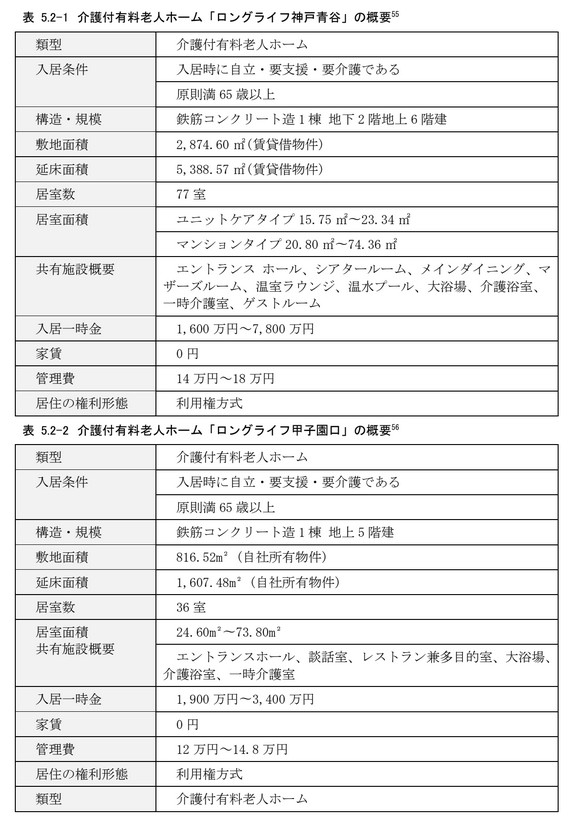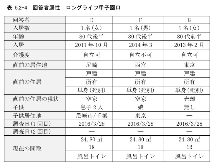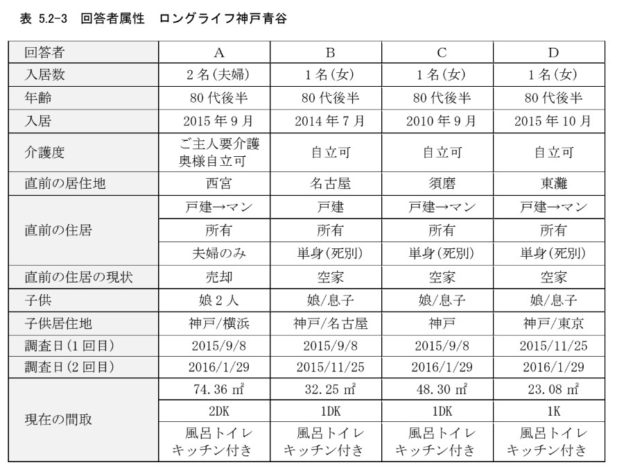 日本ロングライフ(株)が運営するロングライフ神戸青谷(神戸市中央区)、ロングライフ甲子園口(西宮市)の2つの施設において、回答者A~Gの計7組(単身者の場合も「1組」としている)、8人の入居者に会話形式による聞き取り調査を行った。