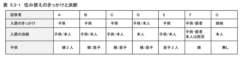 今回聞き取り調査を行った7組のうち、回答者Fを除く6組が「入居をして良かった」と感じている。本人が住み替えを決断した理由としては、自分自身でも体力に不安を感じることがある、子供に負担をかけたくない、助けてくれる人が近くにいて欲しい、などがあげられた。回答者Fは1人での生活が困難なため、本人は納得していないが入居をしている。