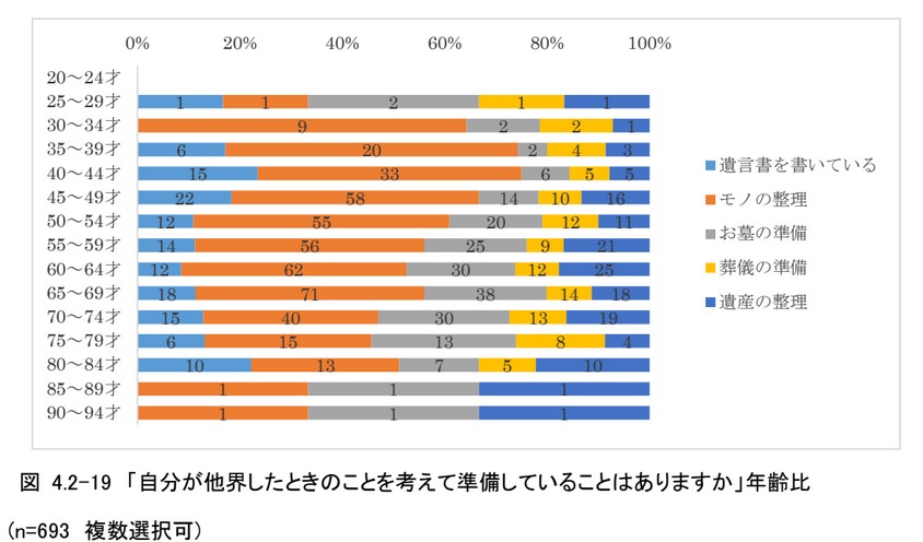 「何も準備していない」と回答した人を除き、準備している項目を選択した人を年齢別に比較すると、若年層でも「モノの整理」や「お墓の準備」、「遺産の整理」を進めていると分かる(図4.2-19)。