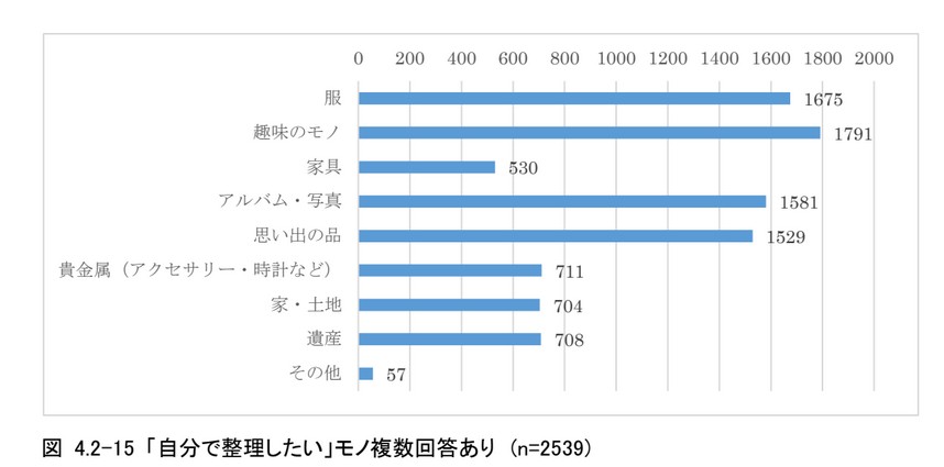 自分で整理したいモノについて、複数選択で具体的に回答してもらった(図4.2-15)。「自分で整理をしたい」の設問で「はい」と回答した人のうち、最も多かった項目は、「趣味のモノ」であり、次いで「服」があげられた。さらに「アルバム・写真」、「思い出の品」も回答数が多い。「その他」は自由記述とした結果、「書籍」が17件あり、「書類」や「PC やスマホのデータ」、「着物」、「投資や株」、「墓」などがあがった。具体的な回答がある一方で、「何から手を付けて良いかわからない」、「不明」という回答もあり、先を見通して整理を進めることの難しさも見えた。