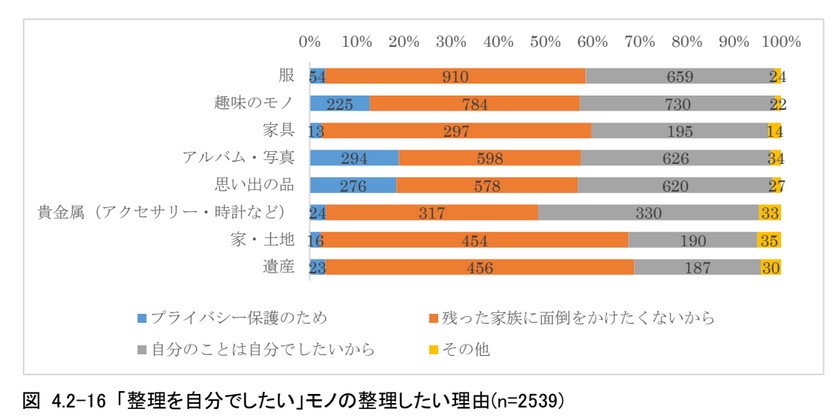 自身で整理をしたい理由は、「残った家族に迷惑をかけたくない」や「自分のことは自分でしたい」という回答が多かった。「アルバム・写真」や「思い出の品」、「趣味のモノ」については、「プライバシー保護のため」という回答の割合が高かった(図4.2-16)。多くの人が「自分で整理したい」と考えていることが分かったが、整理に向けた実際の取り組みや準備を行っているかを調査した。