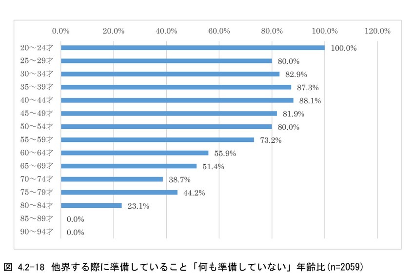 「何も準備をしていない」という回答を年齢別にみると、若い世代の方が多く、年齢を重ねると「終活」のイメージができるようになると推測する(図4.2-18)。しかし、80代の約20%の人はまだ「何も準備していない」ことが分かる。