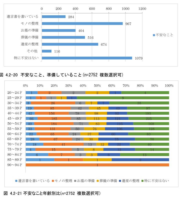自分の死後について「不安なこと」を質問した項目では、「特に不安はない」が1079件で最も多い回答である(図4.2-20)。一方で、自身の身の回りの「モノの整理」に関しては不安に感じている人が多いことが分かる。年齢別に比較すると、年代問わず「特に不安なことはない」という回答が3割~4割程度であり、不安要素としては、ほとんどの世代で「モノの整理」があげられる。「遺産の整理」は50~60代に多いことがグラフから読み取れる(図 4.2-21)。