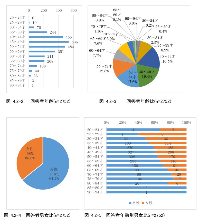 アンケート回答数2752件に関して、回答者の年齢は20代が16件(0.6%)、30代が314件(11.4%)、40 代が990件(36.0%)、50代が835件(30.3%)、60代が419件(15.2%)、70代以上が178件(6.5%)である (図4.2-2、図4.2-3)。男女比は、男性1767件(64.2%)、女性985件(35.8%)である(図4.2-4、図4.2-5)。