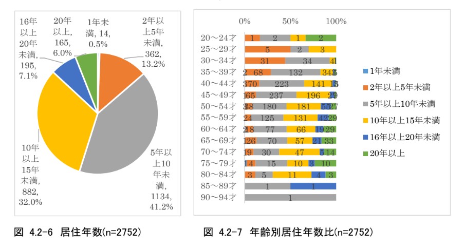 居住年数は、5年以上10年未満が最も多く(約41%)、次いで10年以上15年未満が32%となっている。年齢別の居住年数は、年齢を重ねるごとに居住年数が長くなることが分かる(図4.2-6、図 4.2-7)。また、同居人数の割合についても調査している(図4.2-8、図4.2-9)。