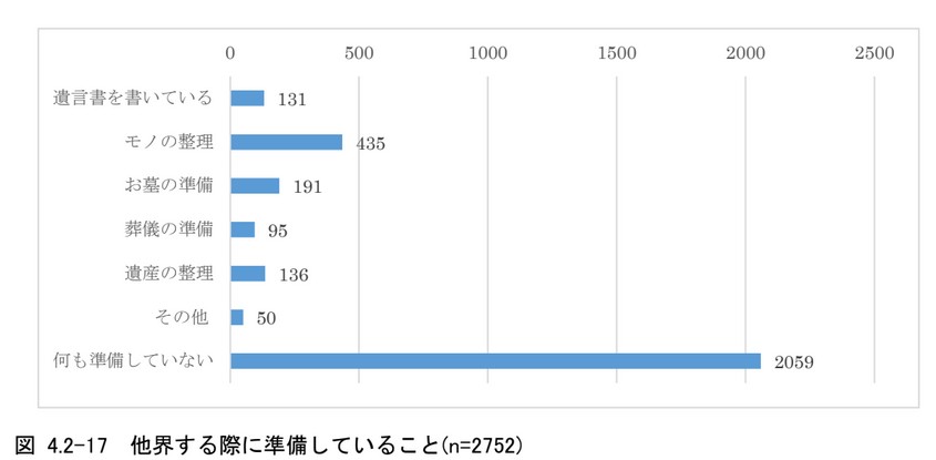 人生の最期に向けて準備することを表す「終活」ということばがあるが、自身の最期を迎えるにあたって、「何も準備していない」という人が多いのが実情だ(図4.2-17)。準備をしている人の回答の中で、身の回りの「モノの整理」を進めている人は多いことが分かる。また「遺産の整理」や、「その他」の記載内容で、「エンディングノートを用意している」という回答があった。エンディングノートに遺産についての遺言やお墓のことなどを記し、家族・親族の為に残す人も多い。